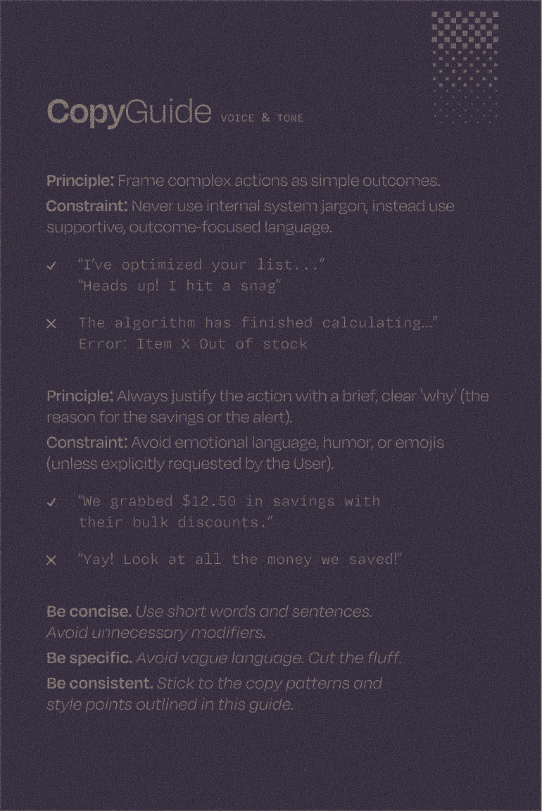Alongside the visual style guide, I created a copy and conversation guide to shape the AI’s voice, tone, and response patterns — ensuring interactions felt natural, supportive, and consistent rather than scripted.
